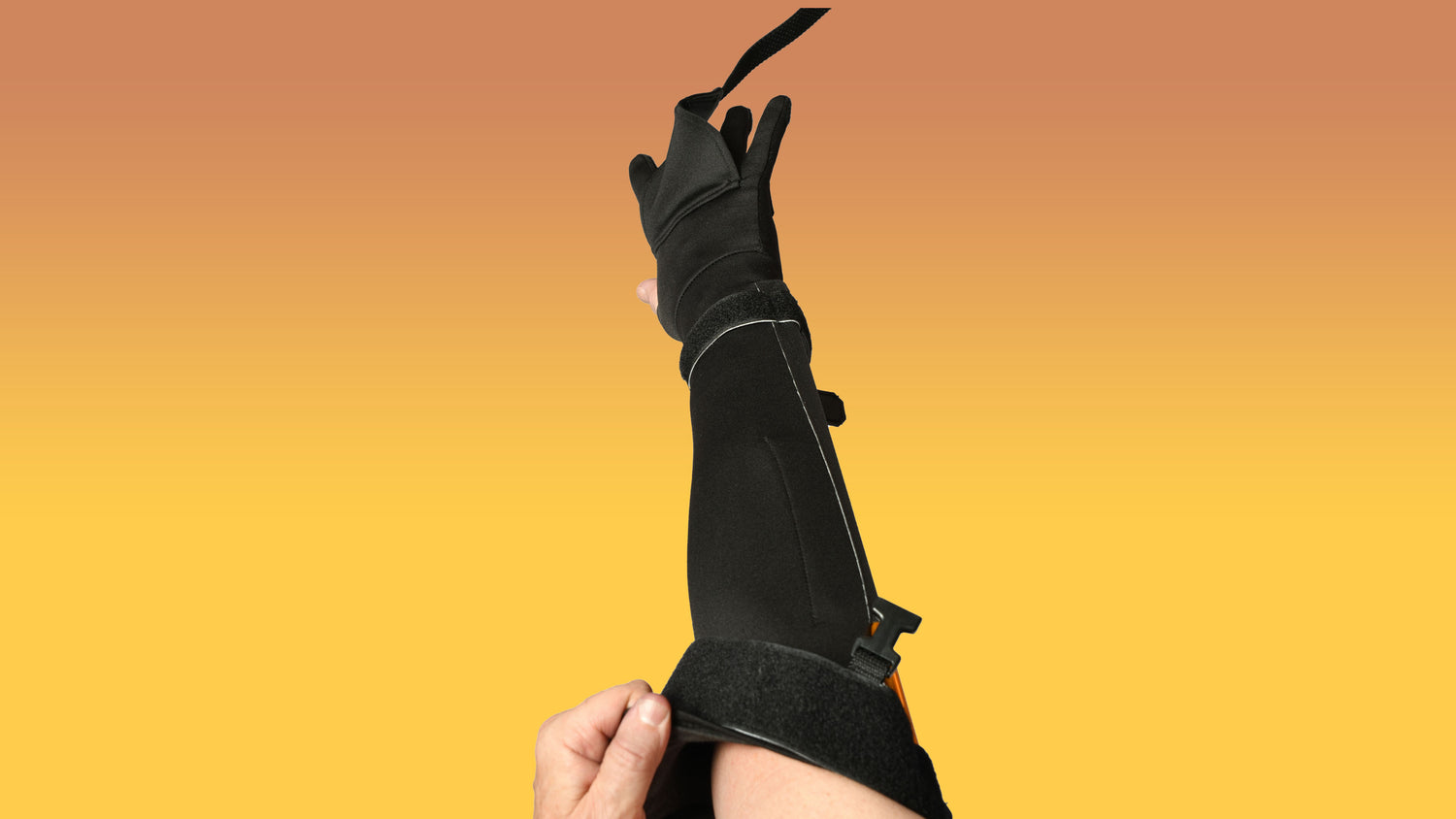 The device consists of Velcro at the tips of the fingers and the corresponding Velcro in the palm. The Velcro is specialized in that it grips in one direction only, allowing the fingers to flex against the palm, but preventing them from extending. With the fingers locked in flexion, the rest of the device locks the elbow into extension and the wrist into flexion and pronation.