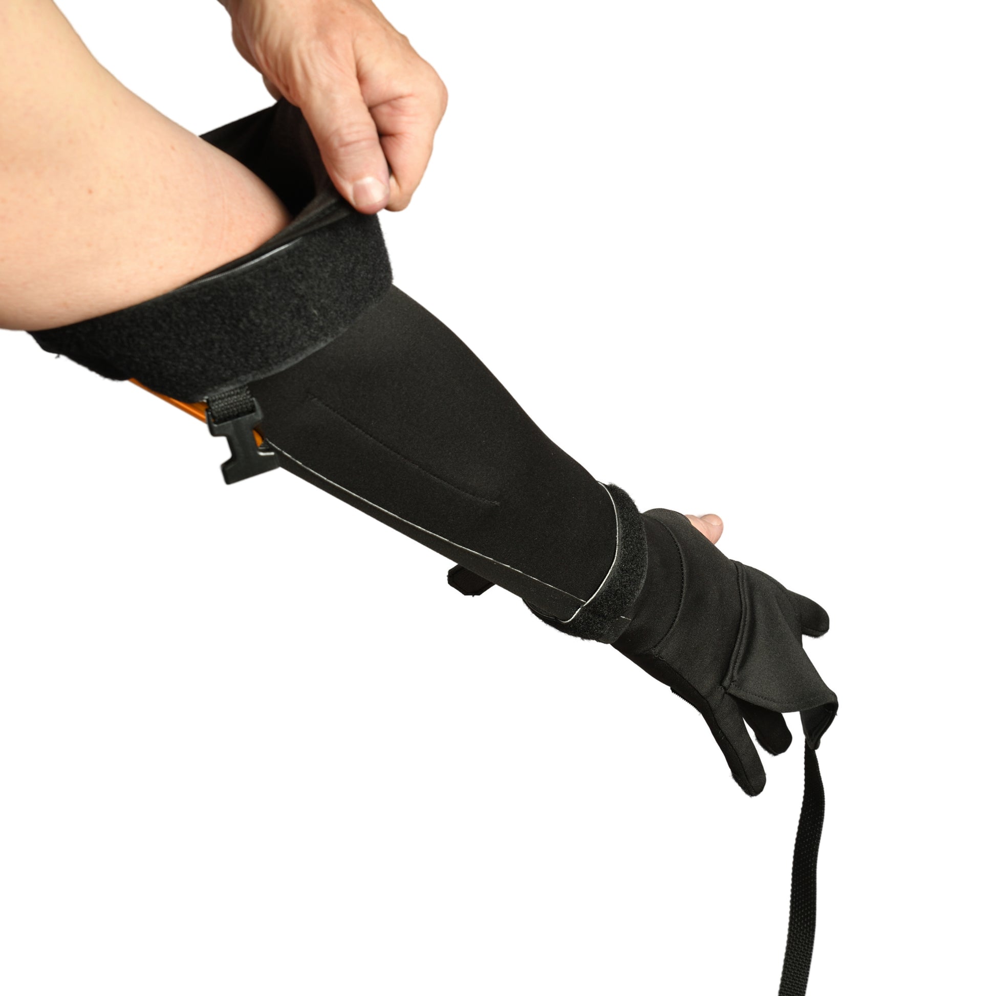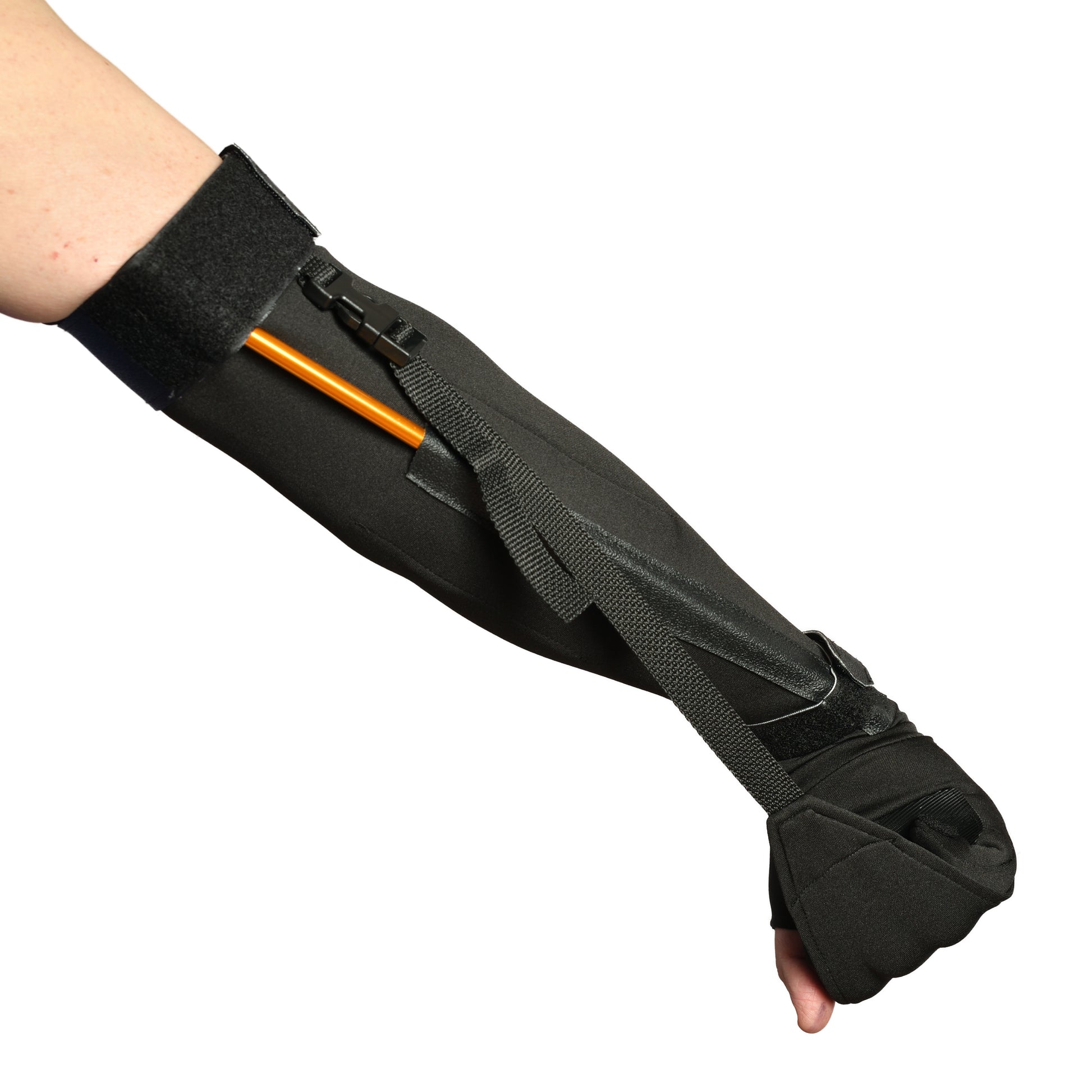 The device consists of Velcro at the tips of the fingers and the corresponding Velcro in the palm. The Velcro is specialized in that it grips in one direction only, allowing the fingers to flex against the palm, but preventing them from extending. With the fingers locked in flexion, the rest of the device locks the elbow into extension and the wrist into flexion and pronation.